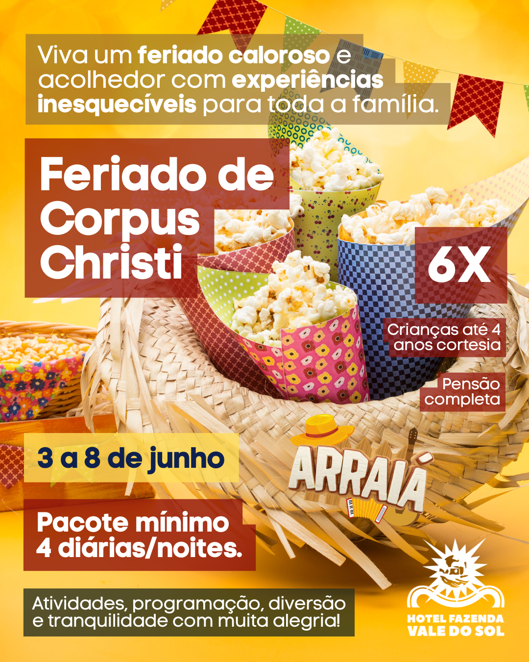 No feriado de Corpus Christi, o Vale do Sol abre as portas para você viver momentos de puro aconchego. É o tempo de aproveitar a brisa da serra e se aquecer em nossas piscinas climatizadas ou relaxar na hidromassagem. Sinta a alegria de ver as crianças se divertindo com a recreação e na fazendinha, enquanto você desfruta do conforto dos nossos chalés e da segurança de um ambiente preparado para receber quem você ama.